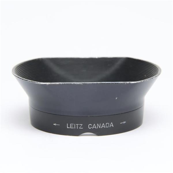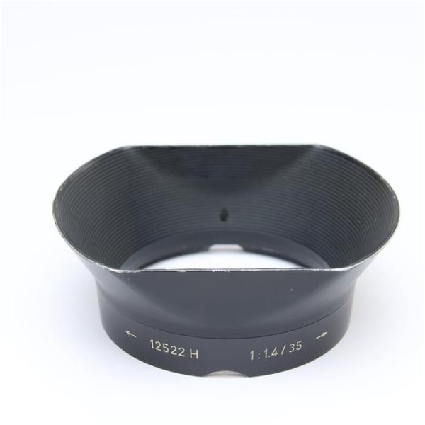 初代ズミルックス35mm f1.4 第1世代用の専用フード。すっきりとしたラッパ型を上下にカットしたような形で、ライカのフードとしては珍しい形状。ズミルックス35mm f1.4 第1世代が非常に高価に取引されており、このフードも単品だと非常に入手しにくいものとなっている。